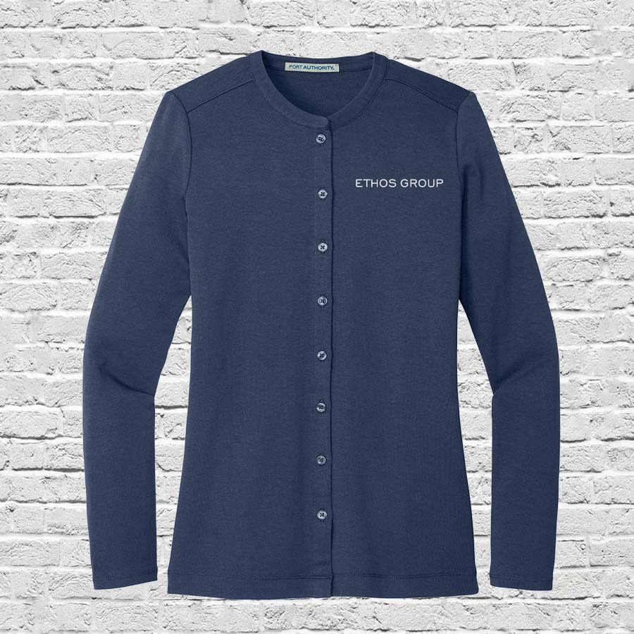 Ethos Group name embroidered on the front left chest in white thread